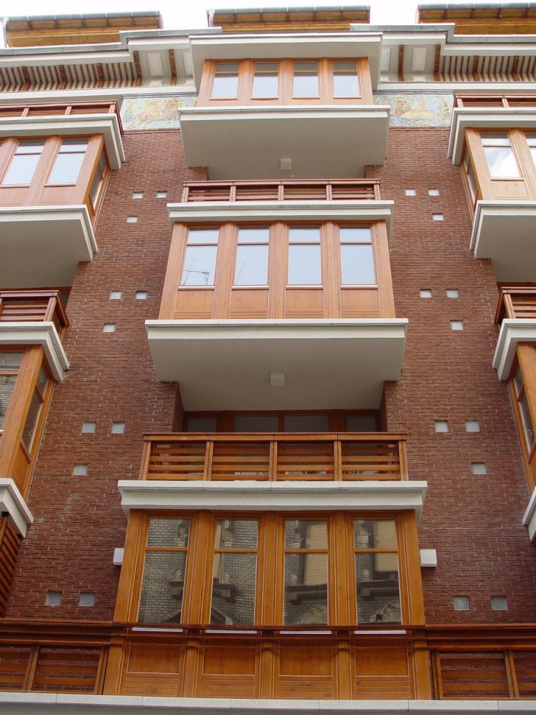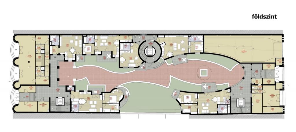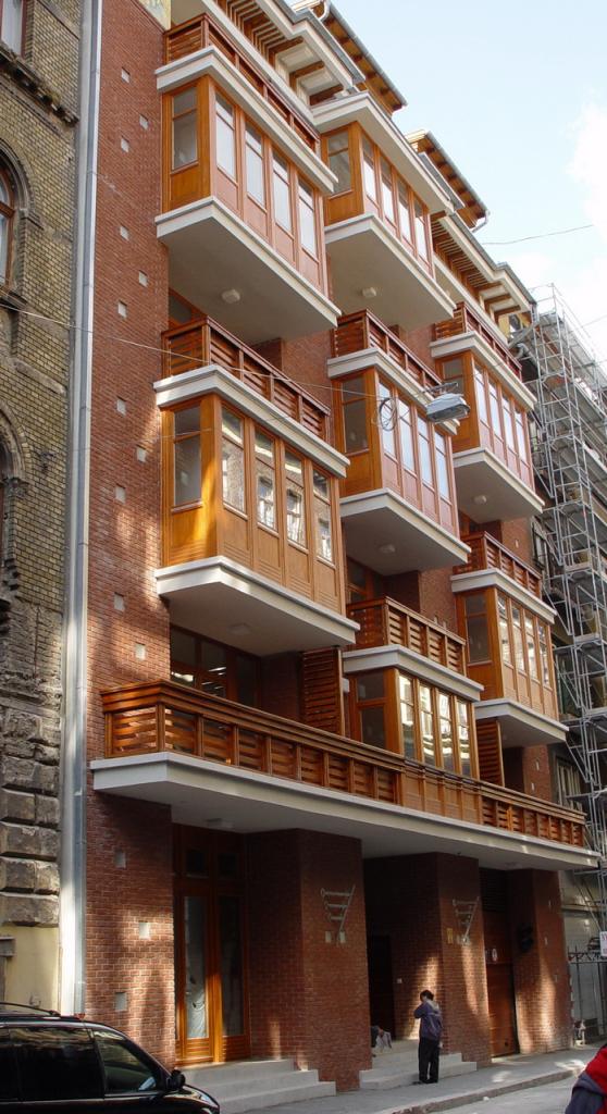 - 1. A lakóépület funkcionális sajátosságait messzemenően figyelembe véve, a leendő lakók igényeit még a 72 lakás nagyságrendje mellett is kielégíteni és szem előtt tartani. Minden lakást egyenként, külön-külön is megterveztünk, bebútoroztunk, hogy a lakások a ház nagyobb összefüggései nélkül is működjenek. A közösségi tereknél is a fent említett szempontok voltak a mértékadóak (tágas lépcsőházak, közlekedők, elegáns, funkcionális bejáratok, falvédő falburkolatok, széles, kiülésre is alkalmas gangok stb.) A szűk, belvárosi környezet adta sajátosságokon belül, fényes, világos lakások kialakítása építészeti eszközökkel (a szűk utcákban az ablakok helyett nagyméretű üvegfalak alkalmazása, a belső udvar kinyitásával és az épület felső szintjein a beépítés visszalépcsőzésével az udvar tágasság érzésének növelése, stb.)